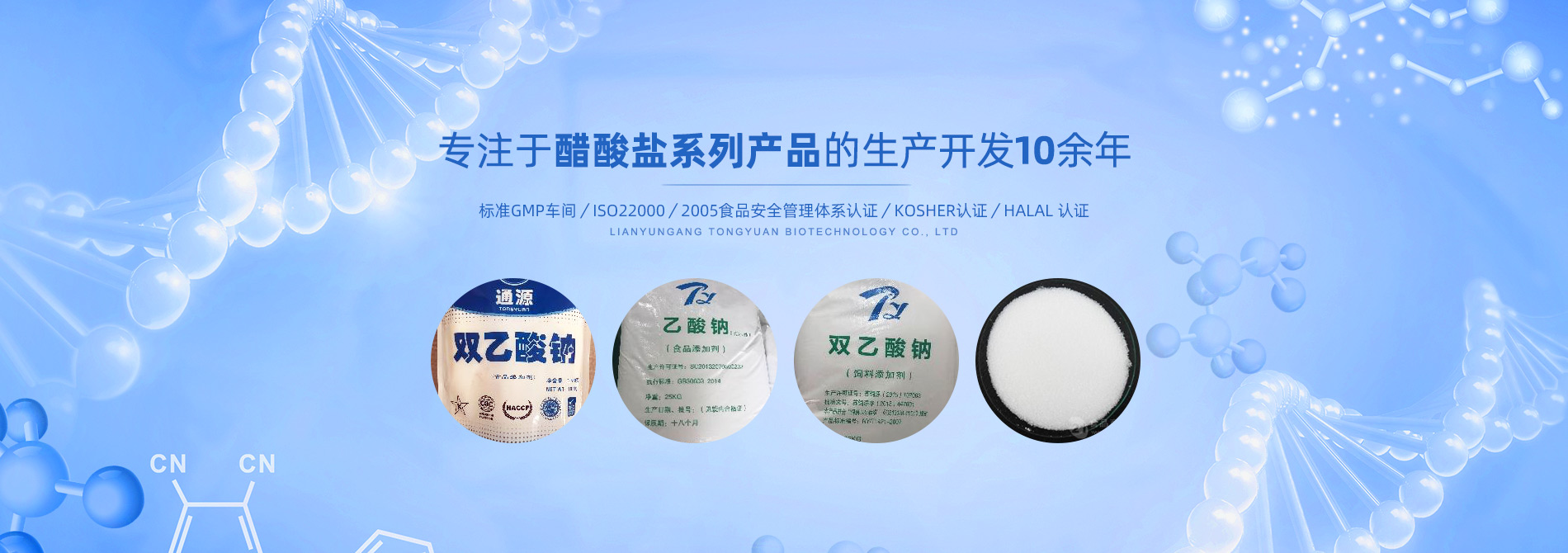 連云港市通源生物科技有限公司 是生產雙乙酸鈉、無水醋酸鈉、三水醋酸鈉、醋酸鉀、乙酸鈉、丙酸鈉、丙酸鈣和氯化鉀等系類醋酸鹽產品的專業制造商。公司專注于醋酸鹽系列產品的生產開發10余年,是國內專業醋酸酸鹽產品生產基地?! ∧壳埃覀円押腿?0多個國家和地區建立長期的業務合作關系,是中國較大的雙乙酸鈉生產商和出口商之一。作為中國食品添加劑和配料協會理事單位,通源公司已建成標準GMP車間5000余平方米,通過了ISO22000:2005食品安全管理體系認證、KOSHER認證、HALAL 認證等,這些都是我們提供高質量產品和優良服務的前提和確保。  生產出色產品,提供優良服務,滿足顧客需要,是我們努力的目標。愿和我們的朋友們攜手,共... →查看詳細